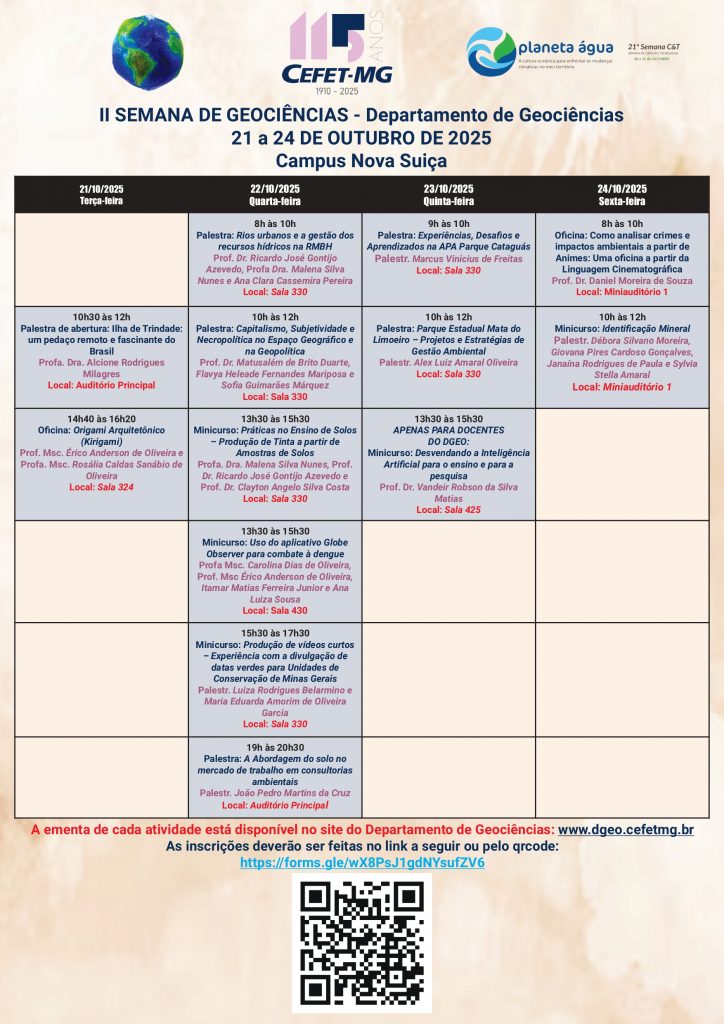 De 21 a 24 de outubro de 2025 acontecerá no CEFET-MG – Campus Nova Suíça – a II Semana de Geociências, evento organizado pelo Departamento de Geociências.